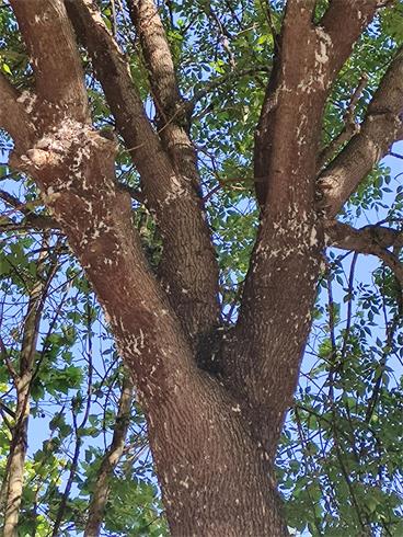 草履蚧可谓是园林中最早爬上树的害虫种类,往往在二月中下旬即从蛰伏中苏醒,活动危害,且群居性强,在园区内往往能看到成群结队的草履蚧上树危害,在树干、枝梢上刺吸植物汁液,往往导致叶片、枝梢卷曲、畸形,生长不良,甚至发不了芽,逐渐走向死亡。